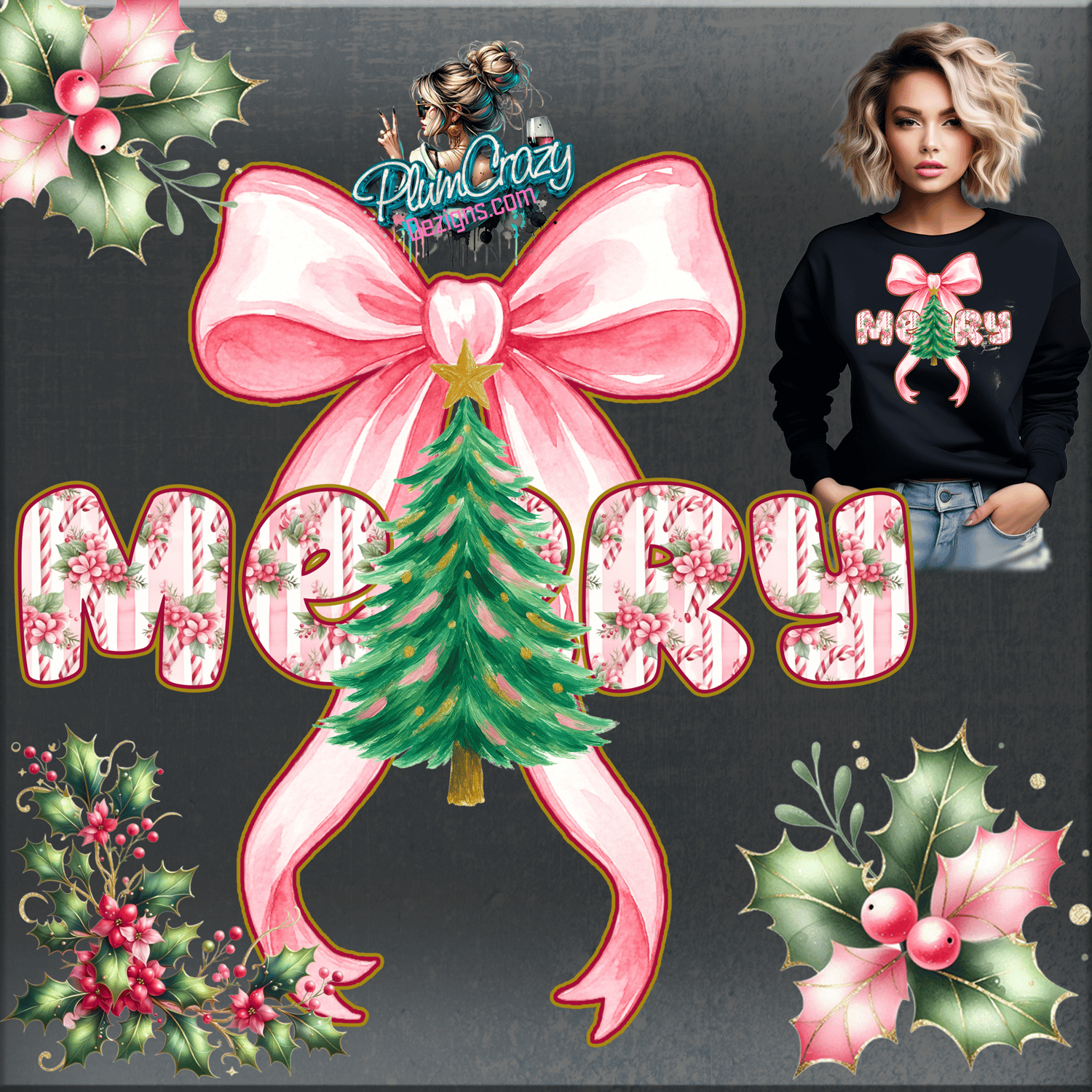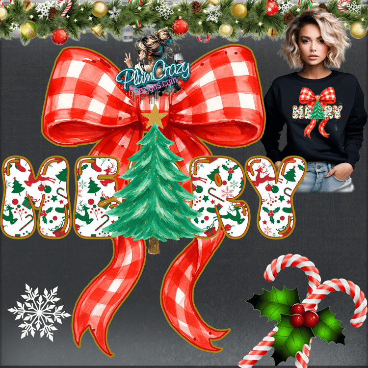 Preppy Merry Christmas Pink Coquette Bow Clipart, Holiday Sublimation Design, Digital Download, Hand Painted, 300 DPI