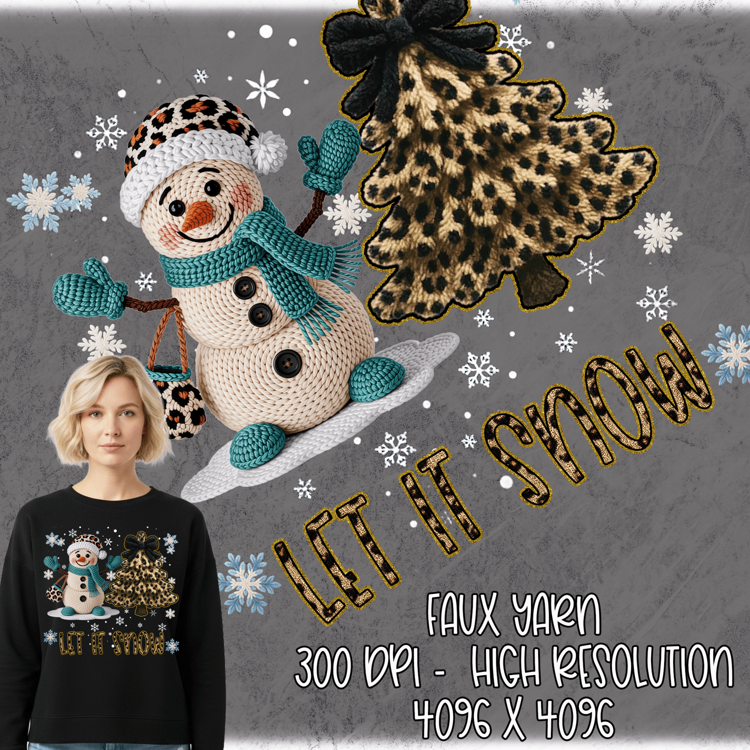 Digital Faux Yarn Snowman, Leopard Christmas Tree PNG, Let it Snow Design, 300dpi High Resolution, Instant Download, Printable, Clipart